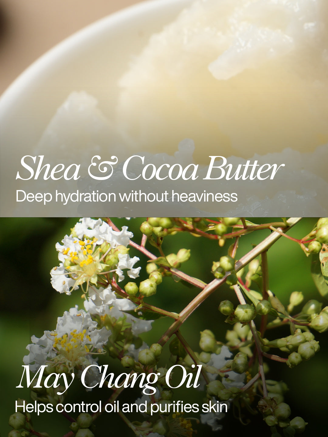 A lightweight, silky moisturiser with Coconut, Shea, and natural oils. Hydrates, soothes, and gently exfoliates with Salicylic Acid. Aloe Vera and May Chang oil promote a radiant, balanced complexion.